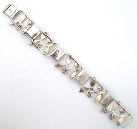 Armlænke af sølv i skønvirkeform med blomsterdekorerede led, prydet med ravperler. L. 20,5 cm., samlet vægt ca. 30 gr.