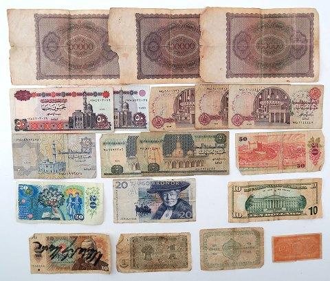Heriblandt gamle tyske sedler fra inflationstiden omkring 1920, Egypten, Europa, 10 $ USA samt Norge, 1 kr 1917 Serie B8