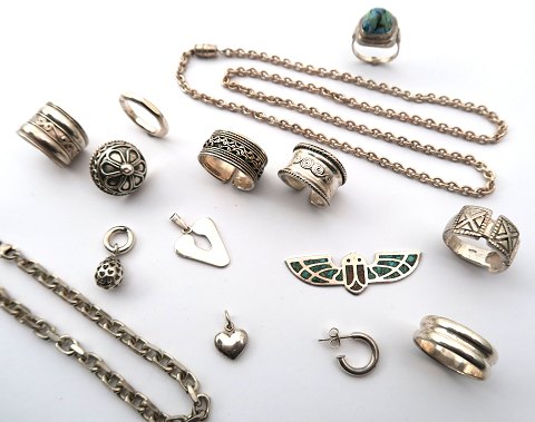 Lot bestående af Halskæde og armlænke, 7 ringe, 4 vedhæng, solo ørestik samt ædelsten belagt plaquette.