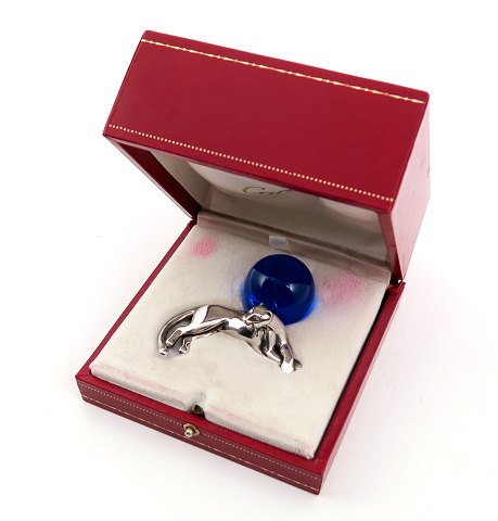 Cartier brevpresse, ref. nr. TI311005 i form af panter af sterlingsølv, liggende ved kugle af blåt krystalglas Originalt Cartier etui medfølger. Vægt med glaskugle ca. 90 gr