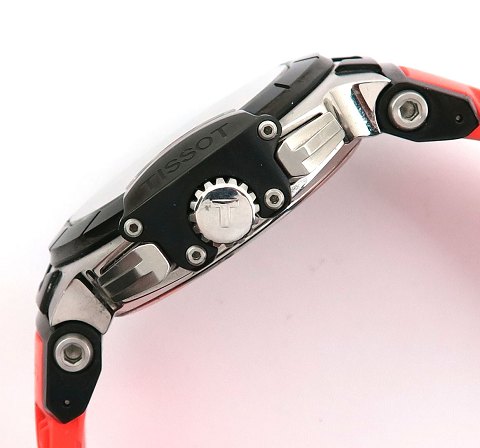 Tissot T-Race chronograph herrearmbåndsur, ref. nr. T 048417 A i urkasse af stål med dele af keramik. Sort skive bag safirglas med stregindikation, Tachymeter, central og separat sekundviser samt chronograph funktioner. Quartsværk ETA G10.211, urkasse diameter 45 mm. Orange gummirem med foldespænde af metal.