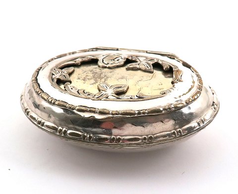Skønvirke snusdåse/pilleæske af lethamret sølvplet. Låg dekoreret med blomster og bladværk. L. 66 mm. stemplet Aug. P. Alpacca