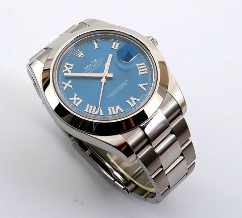 Rolex Oyster Perpetual Datejust II herrearmbåndsur, ref. nr. 116300 i urkasse og med lænke af stål. Blå skive bag safirglas med romertal, central sekundviser og datovisning i #3 position. automatis værk kaliber 3136 med 48 timers gangreserve. Urkasse diameter 41 mm. Lænke med foldelås.