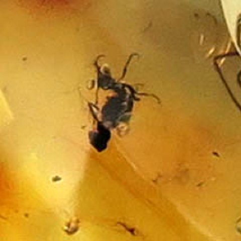 Halssmykke af sterling sølv med tranparent ravdråbe med indeslutninger i form af edderkop og myre. Vedhæng L. 34 mm., sølvkæde L. 50 cm. Opbevaringsæske medfølger.