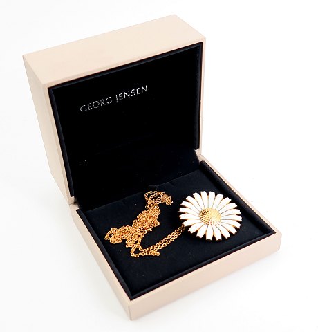 Georg Jensen halskæde med Marguerit vedhæng af forgyldt sterling sølv. Vedhæng med emaille belagte blomsterblade, diameter 43 mm., Kæde L. 88 cm., samlet vægt ca. 26,5 gr.