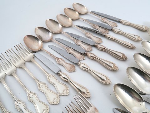 Gabextra bestik af sølvplet bestående af 6 middagsgafler, 6 middagsskeer, 6 middagsknive, 6 frokostskeer, 7 frokostknive, 9 frokostgafler., 2 smørskeer, 3 théskeer samt 1 ostekniv.