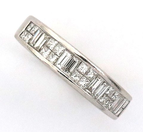 Ring af 18 kt. hvidguld med let forhøjet skinne, prydet med baguette og princess cut diamanter, sammenlagt 0,76 ct. Ring Str. 54, totalvægt ca. 5,5 gr.