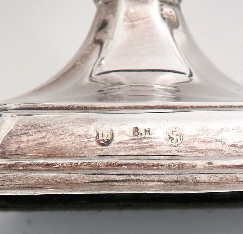 Par trearmede, udfyldte stager af sølv på i barokform på profileret fodstykke, herover balusterformet stamme med to svungne arme, afsluttet med lysmanchetter. H. 14,5 cm. Danmark 1945