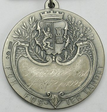 Skyttetegn af sterling sølv *För Fosterlandet* fra Göteborgs og Bohus Läns skytteforbund. revers med gravure "G Starandquist för 452 p. 1921". Diam. 33 mm., vægt 15,8 gr.