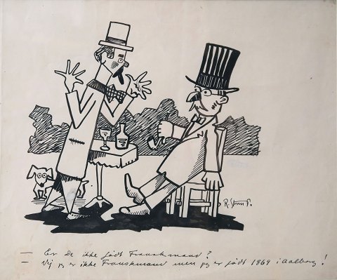 Robert Storm Pedersen, signeret tuschtegning med påtegning: Er De ikke født Franskmand? . Nej jeg er ikke Franskmand men jeg er født 1869 i Aalborg! Blad 30 x 24 indrammet med passepartout bag glas.