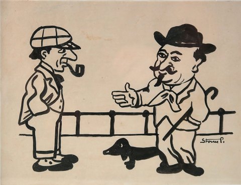 Robert Storm Pedersen, signeret tuschtegning: To personer i samtale. Ifølge påtegning er det Storm P. himselv til venstre. Blad 24 x 18 indrammet bag glas. Tidligere solgt ved Arne Bruun Rasmussens Kunstauktioner.