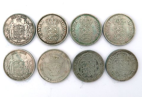 2 kroner 1923(2), 2 kroner 1930(2), 2 kroner 1937(3) og 5 kroner 1960, alle sølv