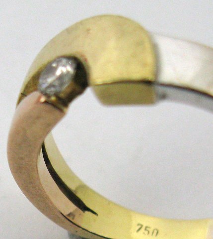 Ring af trefarvet guld 18 kt prydet med brillant ca. 0,10 ct