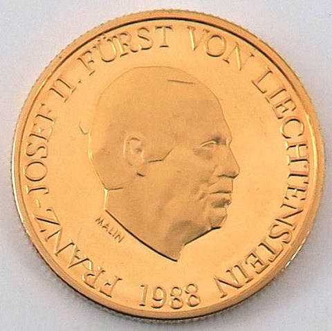 Lichtenstein, 50 Franken, 1988, guld, 10 gr., .900, Y #21