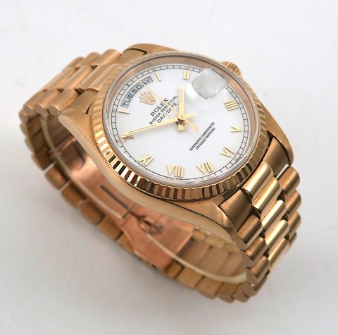 Rolex herrearmbåndsur, model Day/Date, ref.nr.: 18238, i urkasse og med President lænke af 18 kt. guld, hvid skive med romertal, central sekundviser, dag- og datofunktion, safirglas, automatisk urværk. Urkasse diameter 36 mm. X-serie produceret 1991