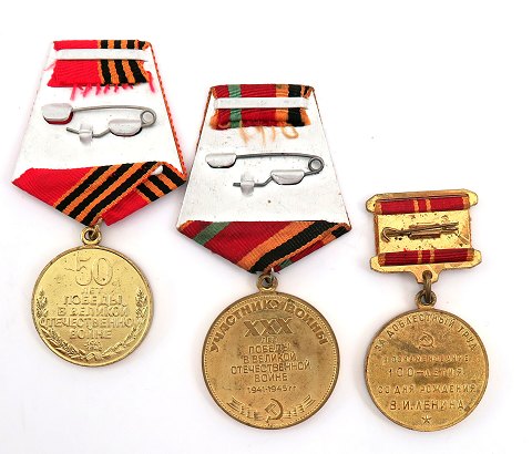 Medaille til erindring for 30 års og 50 års afslutning af II. verdenskrig (2) samt medaille til erindring om 100 året for Vladimir Lenins fødsel. Diameter 36, 34 og 32 mm.