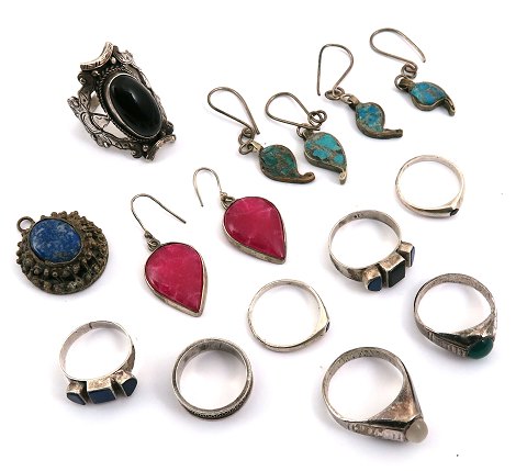 Lot bestående af dragering Str. 64, 3 par ørelokker, vedhæng samt 7 ringe, alle Str. ~58