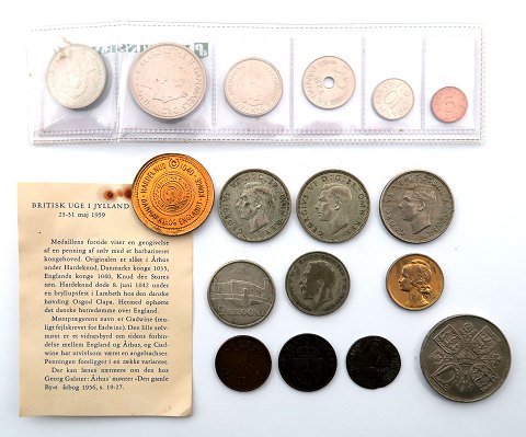 Lot Europa + medalje, hovedsageligt England(5) dertil 2 Krooni Estland 1930, 4 centavos Portugal 1919, 5 Penniä Finland 1873, III Pfenning 1759 samt 4 Pfenninge 1856 og medalje Hardeknud 1035 samt dansk banksæt 1984