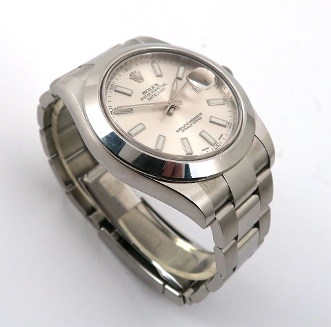 I urkasse og med lænke af stål. Sølvfarvet skive bag safirglas med stregindeling, central sekundviser og datovisning i #3 position.
