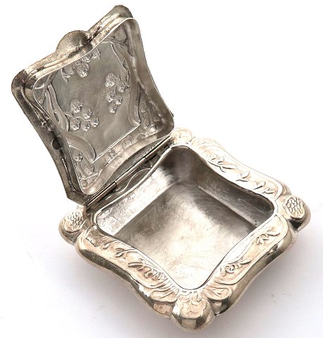 Ligesidet snusæske/pilleæske af sterling sølv, drevet med orientalske mønstre. 50 x 50 mm., vægt ca. 36 gr.