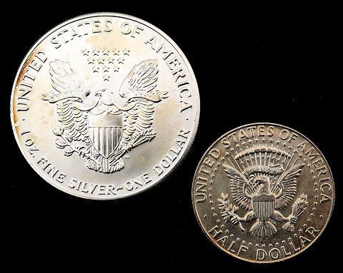 USA, 1 Dollar sølv 1991 - KM 273 og Half Dollar sølv 1964 - KM 202