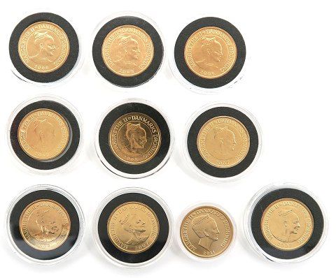 Erindrings 10 kr 4x 2007, 3x 2008, 2x 2009 samt 2011, alle ucirkuleret i plexiglaskapsel.