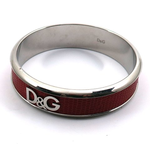 Dolce & Gabbana armring af blankpoleret stål, skinne beklædt med firbenpræget skind og prydet med D&G logo. Indvendig diameter 65 mm.