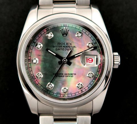 Rolex Oyster Perpetual herrearmbåndsur, ref. nr. 116200 i urkasse og med lænke af stål. Perlemorskive bag safirglas med diamantbesatte indikationer, central sekundviser og datovisning i #3 position. Automatisk urværk. Urkasse diameter 36 mm.