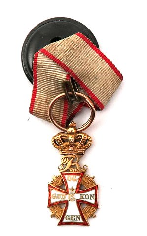 Frederik VII minature orden *Dannebrog orden* med sløjfe og påsyet knap. Orden 22 x 11 mm., vægt 2,3 gr.
