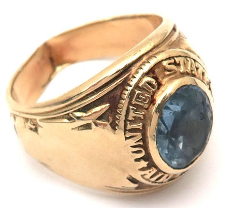 United States Airforce ring af 14 kt. guld, bred skinne ensidigt dekoreret med ørn. (Den flyvende ørn med globen på den anden ringside er omdannet til monogramspejl). Fronten er prydet med aquamarinblå beryl, omkranset med skrift: United States Air Force. Ring Str. 64, samlet vægt ca. 26 gr.