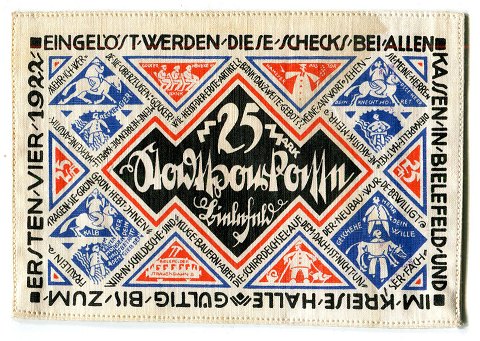 Tyskland, Stadtsparkasse Bielefeld, 25 Mark stofpenge ucirkuleret med tryk på begge sider. Trykt hos E. Gundlach i 1921, 12 x 8 cm *Zur 700-Jährigen Jubiläumsfeier der Stadt Bielefeld am 15. Juli 1921*.