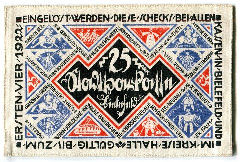 Tyskland, Stadtsparkasse Bielefeld, 25 Mark stofpenge ucirkuleret med tryk på begge sider. Trykt hos E. Gundlach i 1921, 12 x 8 cm *Zur 700-Jährigen Jubiläumsfeier der Stadt Bielefeld am 15. Juli 1921*.