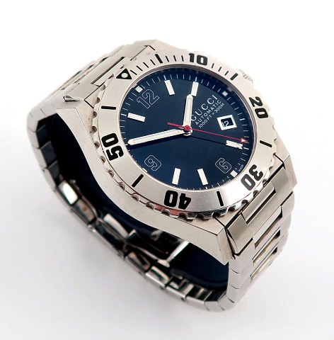 Gucci Pantheon 115 dykkerur, ref. nr. YA 115211 i urkasse og med lænke af stål. Sort skive bag safirglas med stregindikation, central sekundviser og datovisning i #4 position. Automatisk urværk. Urkasse diameter 44 mm.