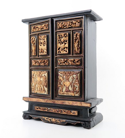 Antik Look kinesisk alterskrin af træ på sokkel med skæringer, fortil to alterdøre med påsatte, forgyldte "lacquer" dekorationer. Indvendig dekoreret med landskabssceneri. 20. århundrede. H. 38,5 cm, Sokkel 28,5 x 12,5 cm.
