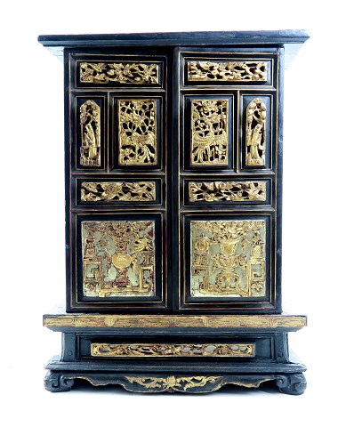 Antik Look kinesisk alterskrin af træ på sokkel med skæringer, fortil to alterdøre med påsatte, forgyldte "lacquer" dekorationer. Indvendig dekoreret med landskabssceneri. 20. århundrede. H. 38,5 cm, Sokkel 28,5 x 12,5 cm.