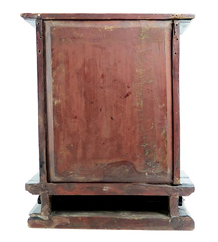 Antik Look kinesisk alterskrin af træ på sokkel med skæringer, fortil to alterdøre med påsatte, forgyldte "lacquer" dekorationer. Indvendig dekoreret med landskabssceneri. 20. århundrede. H. 38,5 cm, Sokkel 28,5 x 12,5 cm.