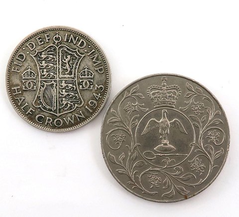 George VI, Half Crown sølv 1943 - KM 156 samt medaille, præget til erindring om Dronning Elizabeth II sølvjubilæum 1977 - KM 920