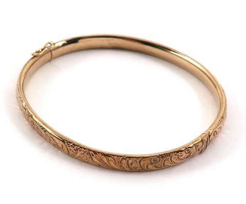 Armring af 8 kt. guld, skinne dekoreret med volutter. Indvendig 54 x 60 mm., vægt ca. 7,3 gr.