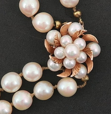 Toradet collier med 7 mm. knudemonterede kulturperler. Blomsterformet lås af 14 kt. guld prydet med 11 kulturperler i forskellige størrelser. Kæde L. ca. 42 cm. 1 perle løs ved låsen.
