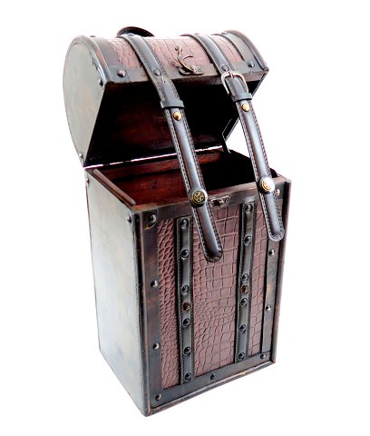 Handy Jet-Set vintransport kasse af træ, betrukket med krokodillepræg. Foroven buet låg med læderstropper. H. 39 cm