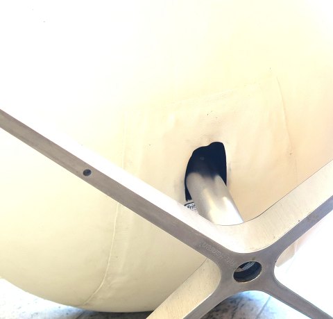 AJ Ægget, hvilestol, ombetrukket i 2012 med hvidt savanna læder hos Horsens møbelpolstrer. Profileret drejelig midtersøjle med firpas fod af helstøbt aluminium.