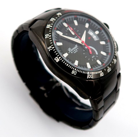 Bonnet herrearmbåndsur, ref. nr. 1371 i urkasse og med lænke af alchron legeret stål. Sort skive med stregindikation, central og separat sekundviser, segment datovisning i #3 position samt chronograph funktioner. Quartzværk. Urkasse diameter 42 mm.