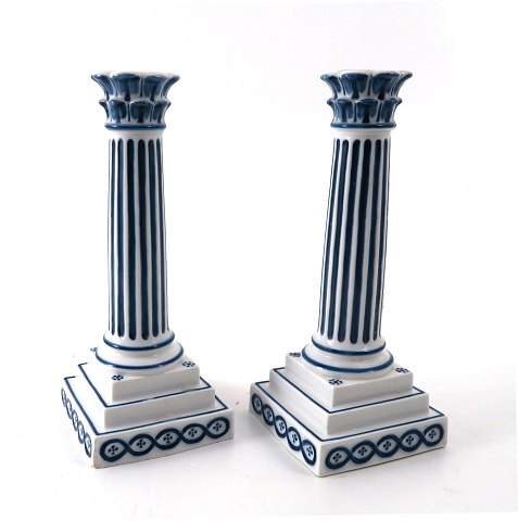 Par musselmalede lysestager af musselmalet porcelæn med kannelleret stamme på ligesidet, profileret fodstykke. Foroven udbøjet dibbelmanchet. H. 20 cm. 1. sortering. Ingen afslag eller revner konstateret.