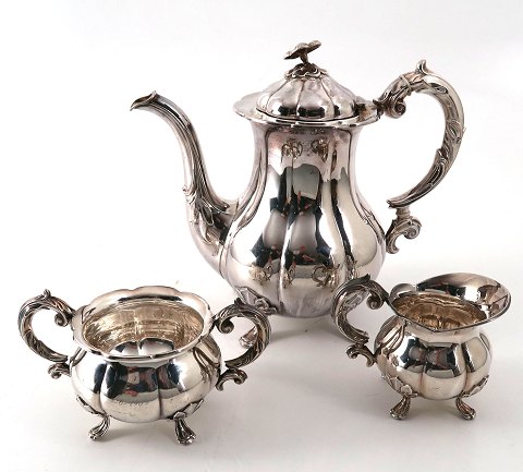 Barokformet kaffestel af sølv bestående af kaffekande samt sukker og flødesæt. Ligeknækket korpus på fire fødder, prydet med bladværk, lågtop afsluttet med blomst. Kande H. 23 cm., samlet vægt ca. 1090 gr. Fremstillet hos Cohr - Fredericia.