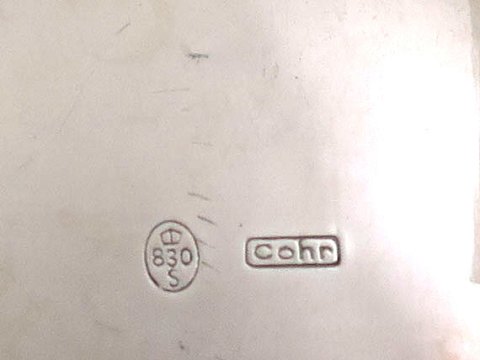 Barokformet kaffestel af sølv bestående af kaffekande samt sukker og flødesæt. Ligeknækket korpus på fire fødder, prydet med bladværk, lågtop afsluttet med blomst. Kande H. 23 cm., samlet vægt ca. 1090 gr. Fremstillet hos Cohr - Fredericia.
