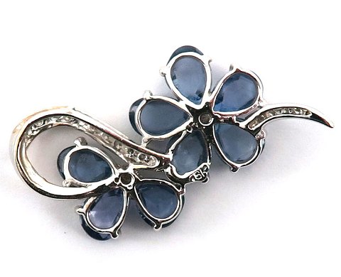 Vedhæng af 8 kt. hvidguld, prydet med facetterede ametyster monteret i form af 2 blomster, hver med brillantsleben diamant på 0,06 ct. samt ydermere prydet med 16 mindre brillantslebne diamanter, samlet ca. 0,20 ct. Vedhæng L. 36 mm., samlet vægt ca. 5,7 gr.