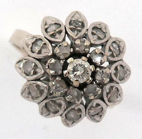 Østerlandsk ring af formodentlig 18 kt. guld med etageforhøjet front, prydet med diamant på ca. 0,10 ct., omkranset af talrige mindre diamanter i gl. slibning, tilsammen ca. 0,25 ct. Ring Str. 50, samlet vægt ca. 4,6 gr. Utydelig stemplet.
