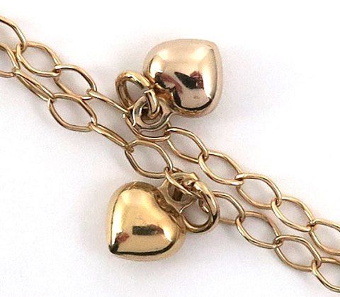 Armlænke af 14 kt. guld med 2 charms i form af hjerte