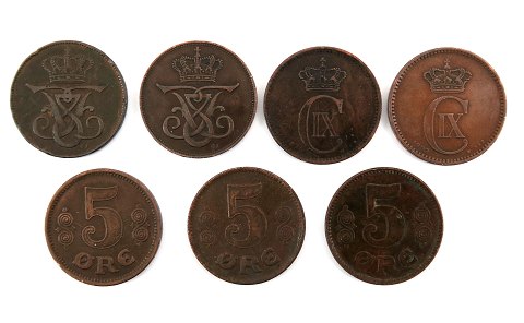 Christian IX, Frederik VIII, Christian X, 5 øre 1874, 1902, 1907, 1912, 1916, 1919 (bronze) og 1921.
