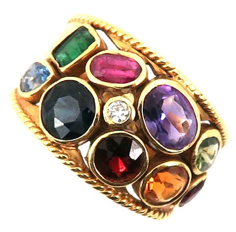 Multicolor ring af 18 kt. guld, prydet med brilllantsleben diamant på 0.05 ct samt diverse, facetslebne ædelsten og halv ædelsten som smaragd, safir, ametyst, granat, topas m.v. Ring Str. 55, samlet vægt ca. 9,5 gr.